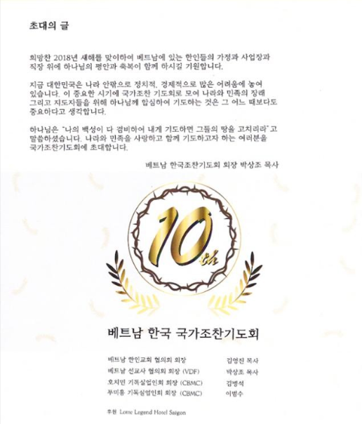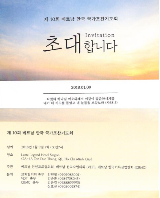 제 10회 베트남 한국 국가조찬기도회1월 9일(화) 있습니다.베트남에 있는 선교사회. 교회연합회. 기독실업인들이 연합하여 대한민국과 베트남을 위해 기도하는 국가조탄기도회가 올해로 10년째가 되었습니다. 기독교 단체및 성도 뿐 아니라 각 기관장과 단체장 들을 초대하여나라와 민족을 위해 기도하며 사회와 소통하는 자리입니다. 호치민에 있는 한인들이 함께 나라와 민족 그리고 베트남을 위해 기도할 때에 하나님께서 들으시고 우리 대한민국과 베트남을 고쳐주시도록제가 국가조찬기도회에서 말씀을 성령의 능력으로 권위있게 증거 할 수 있도록중보기도를 부탁드립니다.