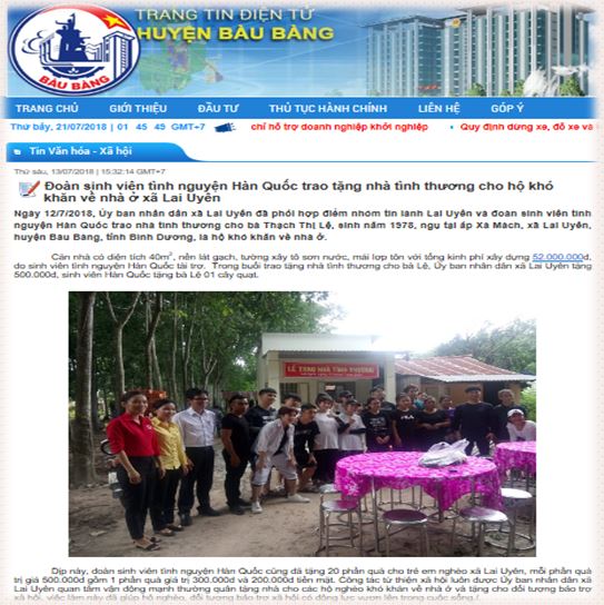 일시 : 2018.08.01 사랑의 집 짓기 행사가 베트남 신문에 기사가 올라왔습니다. 아래는 기사 내용을 발췌해서 소개합니다. 제목 : 한국 자원 봉사자 학생들이 라이웬 (Lai Uyen) 코뮌의 가난한 가정에 주택 기증. 2018년 7월 21일, 라이웬 (Lai Uyen) 코뮌 인민위원회와 한국 자원 봉사 단체가 사랑의 집을 빈증성 바우방 지구의 라위웬 코뮌에 사는 어려운 가정(1978년생 인 Thach Thi Le에게 Xa May Hamlet)에 지어주었다. 집은 40제곱미터의 면적을 가지고 있으며, 벽돌 바닥, 방수 벽, 지붕이 있는 구조로 만들어졌고, 총 건설 비용은 5200 만 VND(베트남 화폐-동)이며 한국 학생들이 후원했다. 한국 학생들은 Mrs. Le에게 기부를 하기로 요청하여 Mrs. Le 는 라이웬 인민위원회를 통해 50 만VND를 기부했다. 이 행사에서 한국 자원 봉사 학생들은 라이웬 코뮌의 가난한 어린이들에게 20 만 점의 선물(스케치북과 크레파스)을 기부했다. 각각의 선물은 현금으로 300,000 VND와 200,000 VND였다. 라이웬인민위원회는 가난한 가정에 주택을 기부하고, 지역사회의 어려운 사람들에게 기부함으로써 가난한 사람들을 도왔다. 이로 인해 사회 보호의 수혜자가 생겨났다. [이 게시물은 최고관리자님에 의해 2020-04-13 15:40:39 교회행사에서 이동 됨] * 만약 아래 영상이 원활하게 보이지 않을 경우 아래 '영상 보러가기' 버튼을 클릭하세요. 영상 보러가기 |